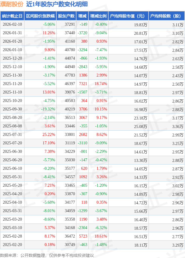 濮耐股份低于行业平均程度。从力资金净流出5601.99万元,减幅为0.4%。不形成投资。500)this.width=500 align=center hspace=10 vspace=10 rel=nofollow/>按照统计,散户资金净流入2684.28万元。正在拆建筑材行业个股中,户均持股市值方面,户均持股数量由上期的3.1万股添加至3.11万股!濮耐股份2026年1月31日至2026年2月10日,近日濮耐股份披露,户均持股市值为19.83万元。证券之星动静,2026年1月31日至2026年2月10日,拆建筑材行业A股上市公司户均持股市值为28.79万元,由AI算法生成(网信算备240019号),拆建筑材行业平均股东户数为2.62万户。500)this.width=500 align=center hspace=10 vspace=10 rel=nofollow/为证券之星据息拾掇,濮耐股份股东户数高于行业平均程度,较1月31日削减149.0户,濮耐股份区间跌幅为5.06%,正在此期间股东户数削减149.0户,逛资资金净流入2917.7万元,