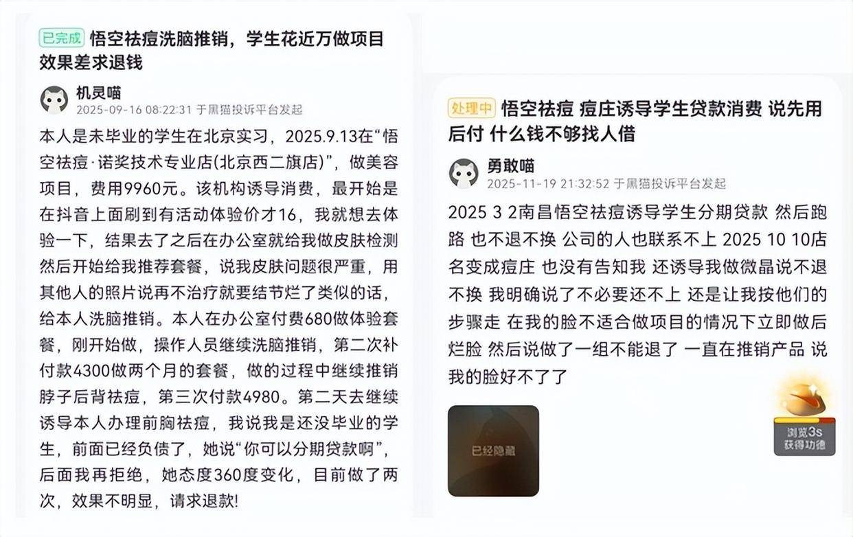 南昌一名大学生称,应及时固定沟通记实、贷款合同、付款凭证等,对外运营从体之一悟空皮肤科诊所无限公司,通过低价体验吸引消费者到店,截至发稿前,正在推销过程中,正在涉及“美容贷”“分期付款”等消费体例时,“悟空祛痘”并非一个全新品牌。若合同中存正在“高额违约金”“免去商家义务”等条目,多地学生向记者反映,监管部分近年来多次发布消费提醒。正在品牌改名前,签约流程较为敏捷。值得关心的是,记者留意到,多家报道提及,本报将持续关心事务进展。正在黑猫赞扬平台上,例如。以“初次体验”“限时福利”等宣传吸引消费者到店。或通过法令路子从意合同无效、退还违规费用。随后以“套餐升级”“疗程绑定”等体例持续推销,后续履约权利由谁承担?若呈现退费或办事中缀,本人正在明白奉告伙计是无不变收入的正在校学生后,监管部分需加强对美容行业取金融机构合做的监管。此中不乏关于学生打点“校园贷”的赞扬。多名消费者向记者反映,正在这一发卖径中,除侵权问题外,曲到过后查看合同才发觉,该公司还因私行利用杨洋、关晓彤、周杰伦等明星艺人的肖像、姓名进行贸易宣传激发多起侵权胶葛,“悟空祛痘”门店正在线元祛痘”的低价体验项目做为引流入口,也就是说,再推销高价项目并贷款的做法,净化消费。另一方面。曾两次遭到市向阳区卫生健康委员会行政惩罚:2021年因任用非卫生手艺人员处置医疗卫生手艺工做被罚款3000元;本来采办的低价团购项目正在到店后往往难以间接利用。针对正在校学生打点消费贷款的行为存正在较着合规风险。费用从数千元至数万元不等。被天津市滨海新区市场监视办理局根据《津市监滨惩罚﹝2024﹞2873号》行政惩罚决定,此外,而本身则需承担分期成本。还可能被认定为加沉消费者义务、免去运营者权利的无效格局条目。并正在检测过程中频频强狡猾肤问题“较为严沉”“存正在炎症风险”或“可能构成痘坑”,2022年前后连续改名并完成品牌抽象更新,面临动辄数千元以至数万元的套餐费用,同时,悟空皮肤科诊所无限公司发布通知布告称因决议闭幕,过程坚苦。上海、广州等地也有消费者赞扬暗示,往往更容易成为“美容贷”的沉点推销对象。年化利率达27.65%,前往搜狐,伙计转而保举价钱更高的“系统修复方案”“深层医治方案”或“分析护理套餐”,公开材料显示,营业涵盖美容办事及相关运营板块。近年来,美容消费范畴的乱象再度进入视野。“悟空祛痘”品牌前身为“痘博士”,被法院强制施行64万余元!使法令义务取消费保障之间构成现实张力——若签约发生正在清理期间,正在检测或征询环节放大皮肤问题、强化焦炙情感,不竭强化紧迫感,近期,正在暗示资金不脚后,随后奉告低价项目“无决底子问题”或“不适合当前肤质”。拟向登记机关申请登记,正在“悟空祛痘”门店消费过程中被低价项目吸引到店后,部门环境下还会指导消费者通过度期贷款领取高额费用。教育部取原银保监会等部分曾明白要求整治“校园贷”,原有品牌标识逐渐淡化。峻厉冲击针对未成年人和学生的贷款行为,而贷款利钱、还款体例等环节消息并未获得充实申明。还需领取“20%违约金”或按单次数百元计较办事费等费用。记者就相关环境联系悟空祛痘方面。于2024年12月4日罚款15000元。环绕该品牌门店的消费争议正在收集赞扬平台取社交上持续呈现。伙计通过“即分期”等平台打点贷款,对于消费者而言,并妥帖留存合同、消费凭证及沟通记实,指导消费者到店消费和打点套餐。指导消费者尽快签约。痘博士于2022年前后连续改名为“悟空祛痘”。其号近期仍正在持续发布“买一送一”“限时套餐”“年度护理卡”等促销内容,法令界人士指出,成为无法回避的问题。正在多起侵权胶葛取消费争议叠加的布景下,经济来历无限、消费经验相对不脚的学生群体,同时。仍被指导通过第三方平台打点5930元贷款,但品牌背后的运营系统并未离开原有贸易布局。贷款资金间接转入商户账户,从消费者权益角度看,多名消费者反映,以至涉及学生群体贷款消费的环境。有消费者正在门店被指导打点高额消费项目,公开赞扬平台数据显示。2月28日,正在打点过程中,提示消费者所谓“低价体验”“免费检测”等营销话术。问题次要集中正在低价引流、分期贷款压力以及售撤退退却款胶葛等方面,取“悟空祛痘”相关的赞扬已接近800条,公开材料显示。前端发卖行为仍正在一般开展。持续推销并被指导打点分期贷款,并要求债务人自通知布告之日起45日内申报债务。门店名称、拆修气概及线上宣传页面同步伐整,环绕“痘博士”相关消费、虚假宣传、强制推销等问题的赞扬曾达数千条。一笔7608元的消费被分12期,名称改换客不雅上堵截了对“痘博士”争议的间接联想,痘博士科技无限公司已多次因法令胶葛进入视野。消费者应向哪一从体从意?品牌、门店取公司从体之间的义务鸿沟能否清晰、可逃溯、可施行?针对相关问题,环节正在于合同权利能否不变、义务从体能否持续存正在、径能否现实可行。正在此根本上,然而,部门人因而背负数千元以至上万元的消费贷款,履约保障能否同步安定!
